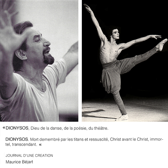 « Dionysos, Dieu de la danse, de la poésie, du théâtre. Dionysos, mort démembré par les titans et ressuscité, Christ avant le Christ, immortel, transcendant. Dieu d’amour et du don total de soi, Sparagmos ».