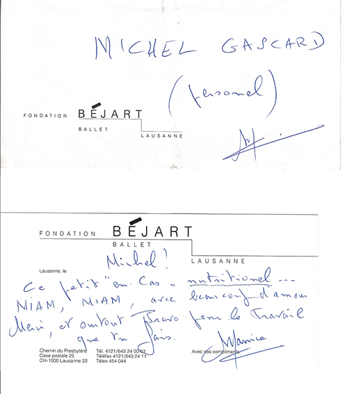 I can't forget the wonderful time I spent watching you teach Rudra the "Tango" that you loved so much, and the creation of "Cercle" at the Béjart Ballet Lausanne, which we all danced with great emotion.